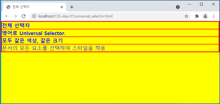 <p>문서의 모든 요소를 선택하여 스타일을 적용</p>
