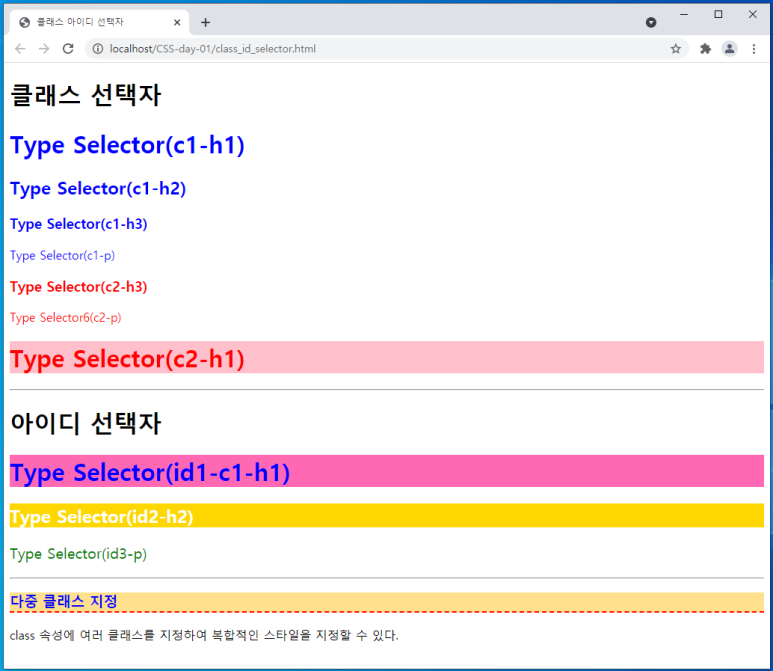 <p>class 속성에 여러 클래스를 지정하여 복합적인 스타일을 지정할 수 있다.</p>