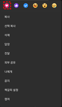 잡다한것들 [카카오톡] 하트 눌르는 법 by sky-j 2023. 6. 30. 반응형 모바일 텍트박스 꾸욱 손으로 터지(1~2초) 터치하면 뜨는 메뉴 여기서 하트 터치 반응형 공유하기 게시글 관리 sky-j 기술블로그 저작자표시 (새창열림) '잡다한것들' 카테고리의 다른 글 구글 크롬 완벽 다크모드 설정하기 (0) 2023.10.18 관련글 구글 크롬 완벽 다크모드 설정하기